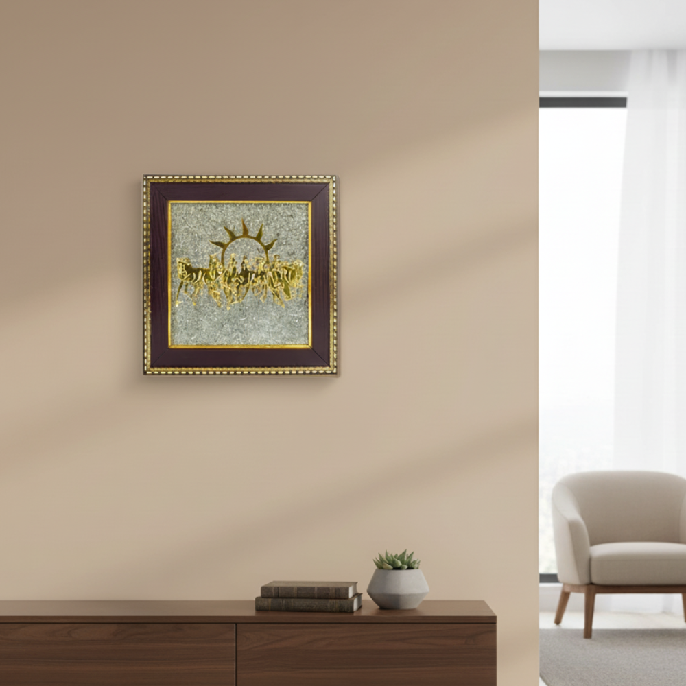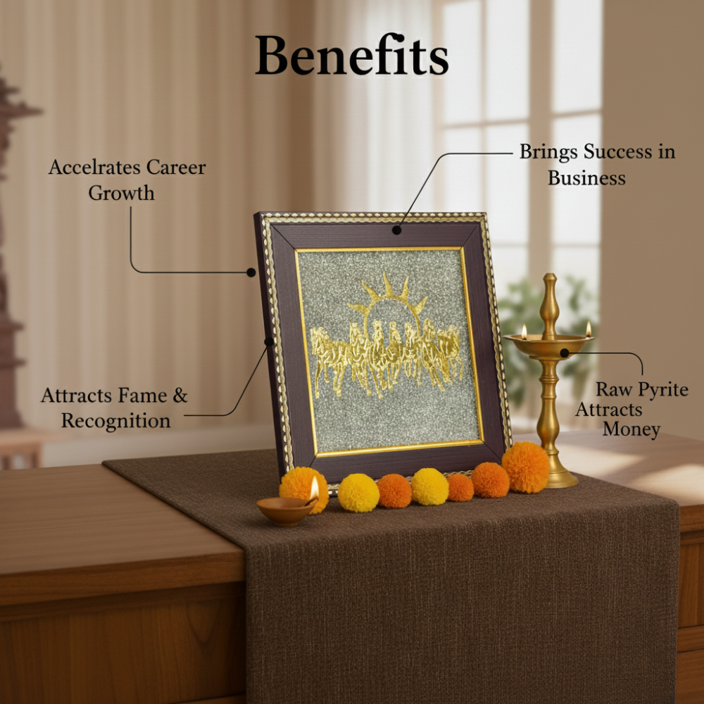 Experience the perfect blend of artistry, symbolism, and natural energy with the 7 Horses on Raw Pyrite Frame by Trishakti Products. Thoughtfully crafted to bring progress, positivity, and prosperity into your surroundings, this unique decorative piece combines the timeless power of the Seven Running Horses with the energetic brilliance of natural Pyrite—often referred to as “Fool’s Gold.” Together, they create a meaningful and eye-catching masterpiece that elevates the energy of any space it inhabits.