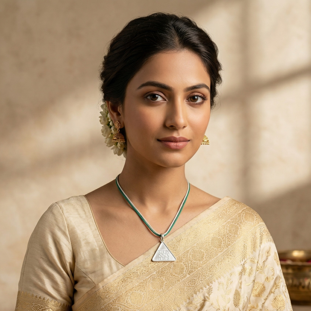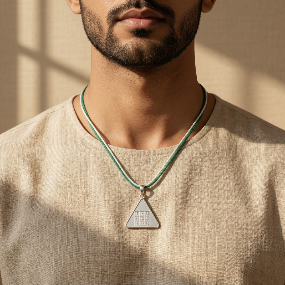 This elegant triangular silver yantra locket blends spiritual significance with stylish design, making it perfect for both men and women who seek positivity, protection, and spiritual balance in their daily lives.