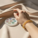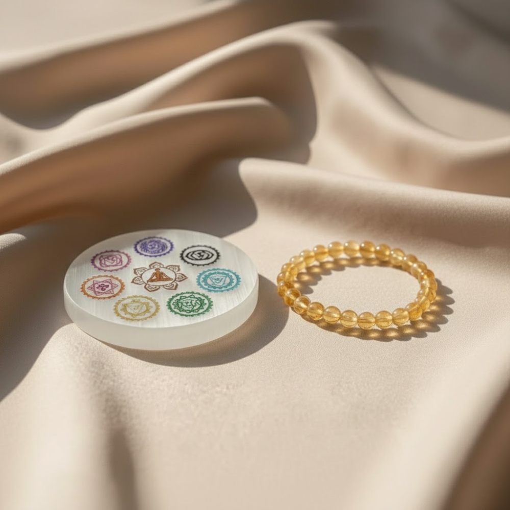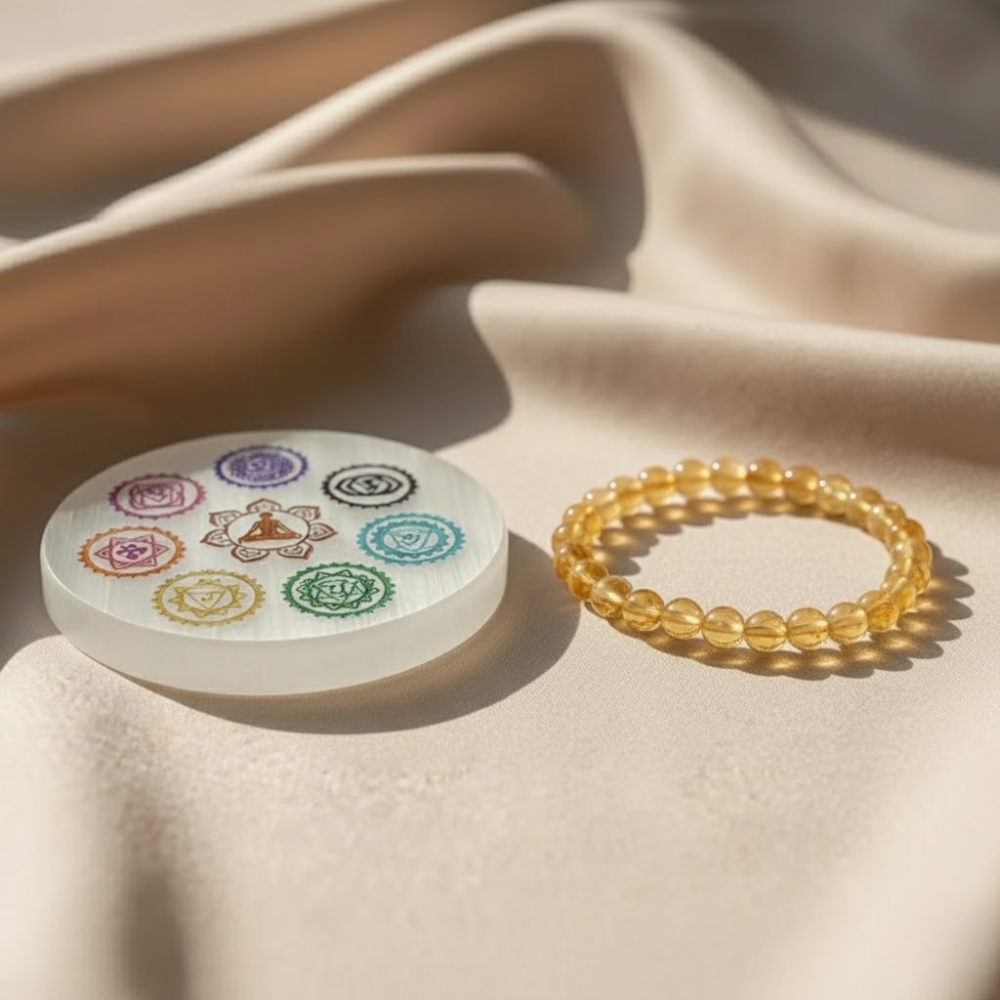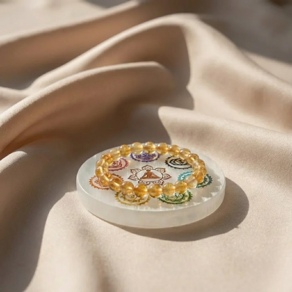 Accompanying the citrine bracelet is a natural Selenite charging plate, carefully crafted to cleanse and recharge your crystals. Made from authentic Selenite, the plate is engraved with seven chakra symbols and features a meditating figure at the center, representing mindfulness, alignment, and energetic balance.