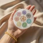 Accompanying the citrine bracelet is a natural Selenite charging plate, carefully crafted to cleanse and recharge your crystals. Made from authentic Selenite, the plate is engraved with seven chakra symbols and features a meditating figure at the center, representing mindfulness, alignment, and energetic balance.