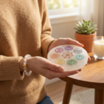 Complementing the bracelet is a Natural Selenite Charging Plate, crafted from genuine selenite crystal. The plate is beautifully engraved with seven chakra symbols in vibrant colors and features a meditating figure at the center, symbolizing balance, mindfulness, and spiritual alignment.