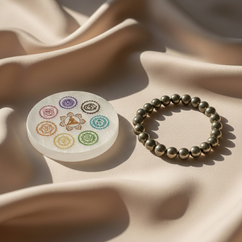 Simply place your Pyrite bracelet—or any crystal or small spiritual tool—on the Selenite plate overnight or for a few hours. Selenite is believed to absorb negative energy and naturally recharge your items, restoring them with high-vibrational energy.